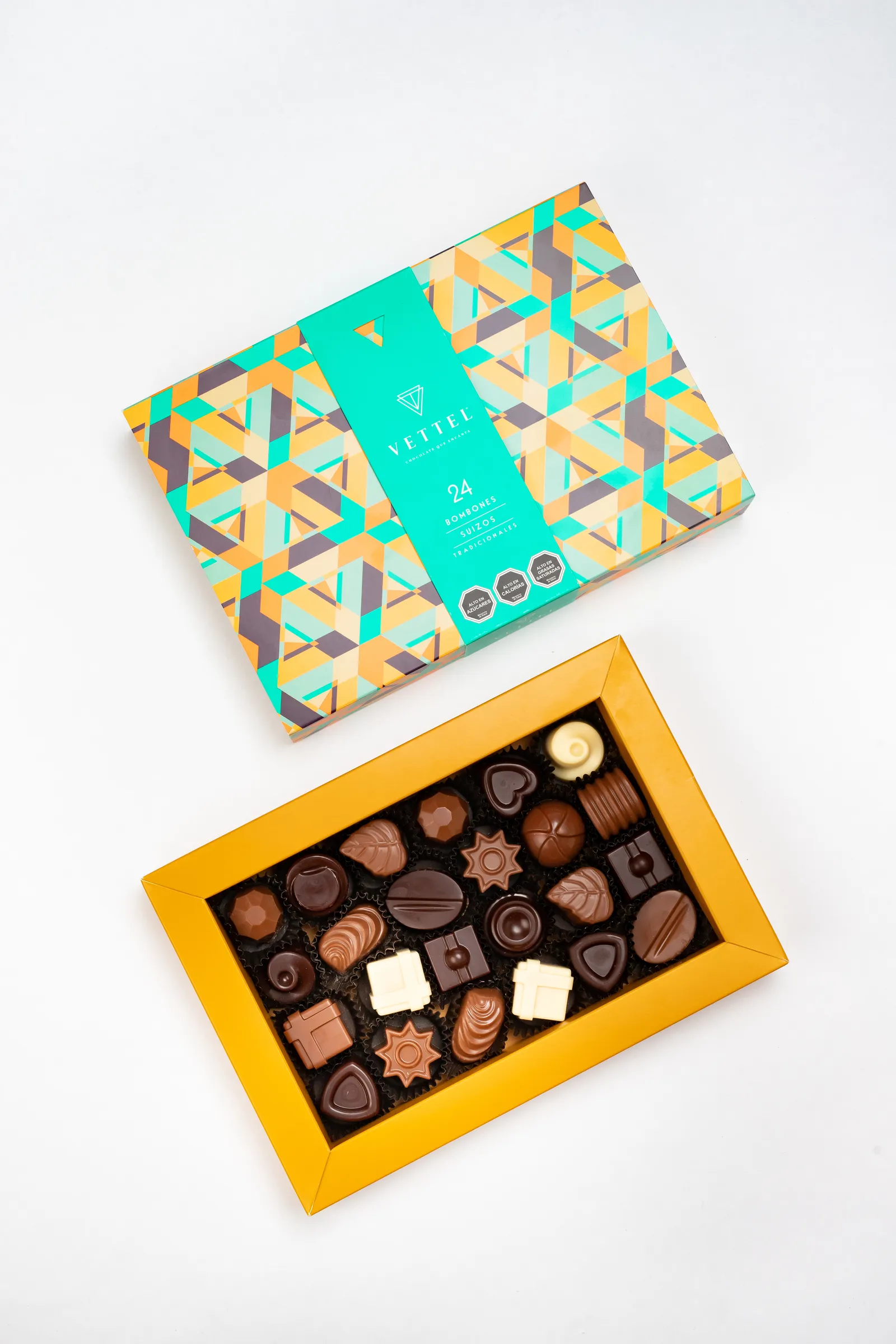 Exquisitos Bombones de Chocolate Suizo con una deliciosa variedad de rellenos. Nuestra caja contiene Bombones cubiertos de Chocolate de Leche, Blanco y Bitter. ¡Te encantarán!. Dentro de estos exquisitos sabores encontramos: - Chocolate Blanco con Crema de Frambuesa - Chocolate Blanco con Crema de Naranja - Chocolate Blanco con Crema de Lúcuma - Chocolate Leche con Crema de Arándano - Chocolate Leche con Crema de Almendra - Chocolate Leche con Crema de Trufa Whisky - Chocolate Leche con Crema de Menta - Chocolate Bitter con Crema de Menta - Chocolate Bitter con Crema de Frambuesa - Chocolate Bitter con Crema de Trufa